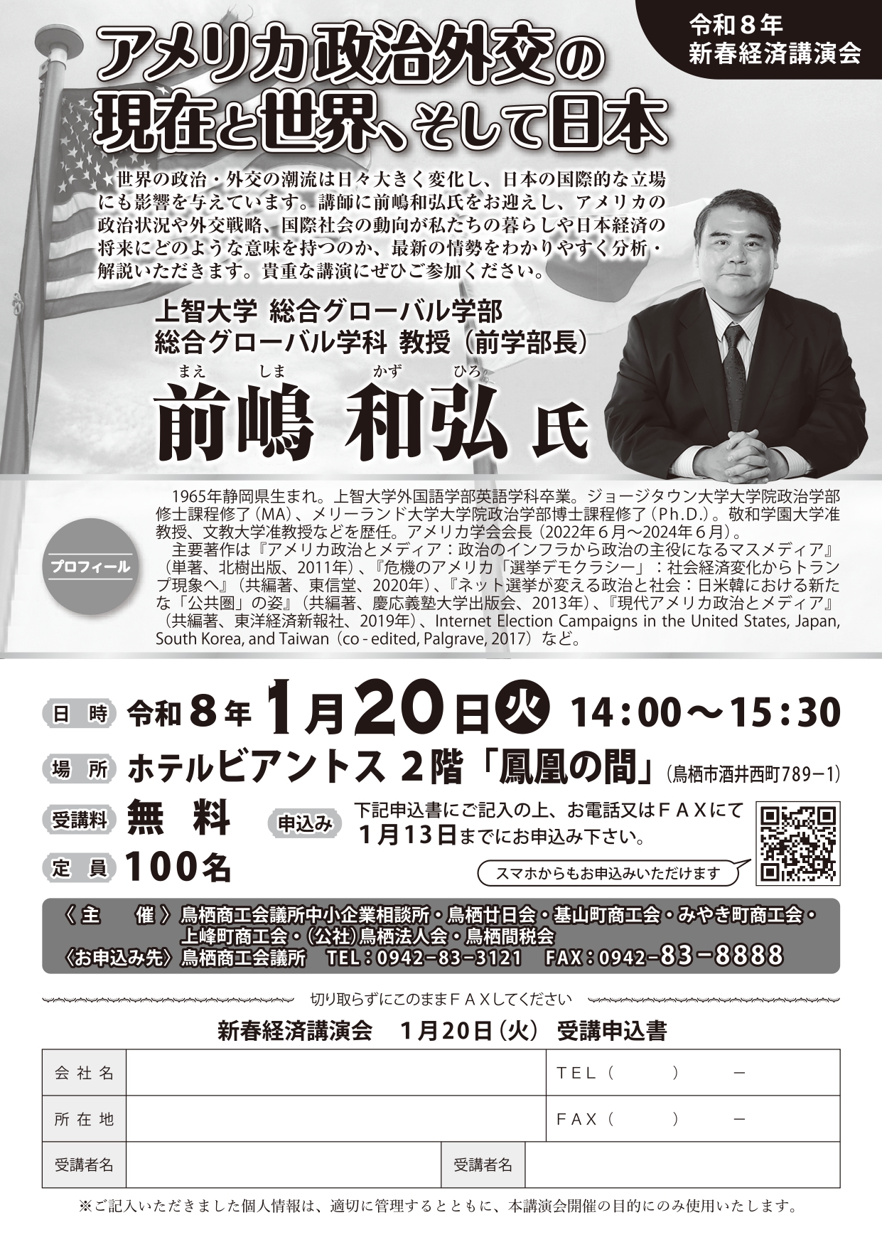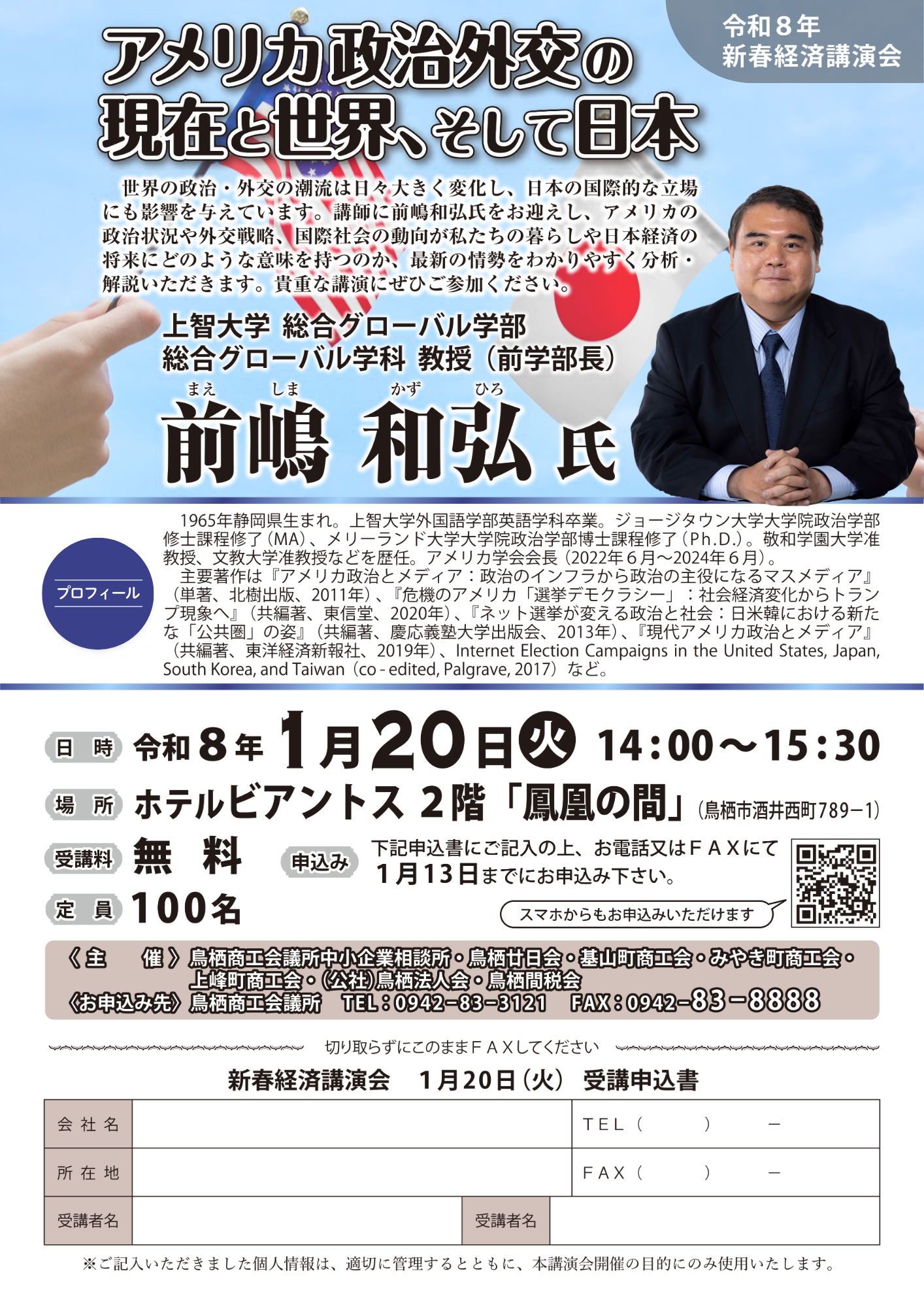 上智大学 総合グローバル学部総合グローバル学科教授(前学部長) 前嶋和弘氏をお呼びし、新春経済講演会を開催します。どなたでも無料でご参加いただけます。是非お申し込みください。