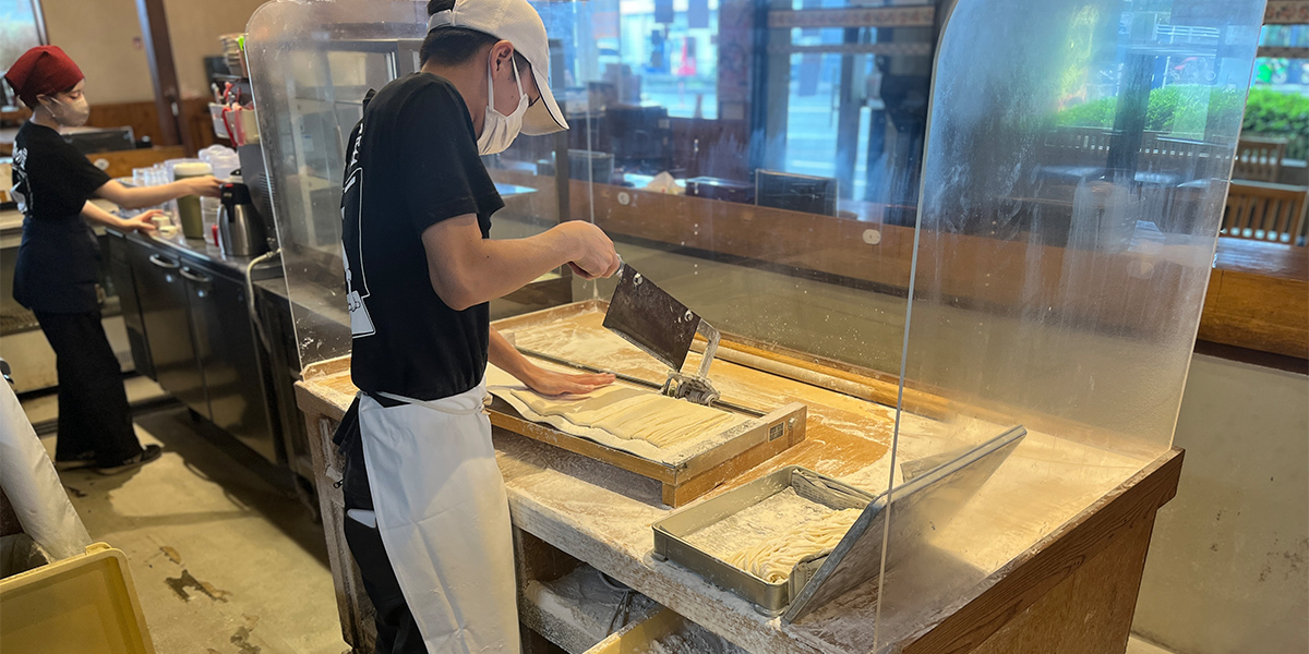 「温かいうどんでは、特に麺と出汁の一体感を感じてほしいですね」と話すのは、店を切り盛りする二代目店主・小畑慶太さん。毎日、仕込みから提供まで一切の妥協なく手作業で行われるうどん作り。夏場は「ざるうどん」や「ざるそば」も人気で、冷たいメニューで麺そのものの風味とコシを楽しむ人も多いと言います。