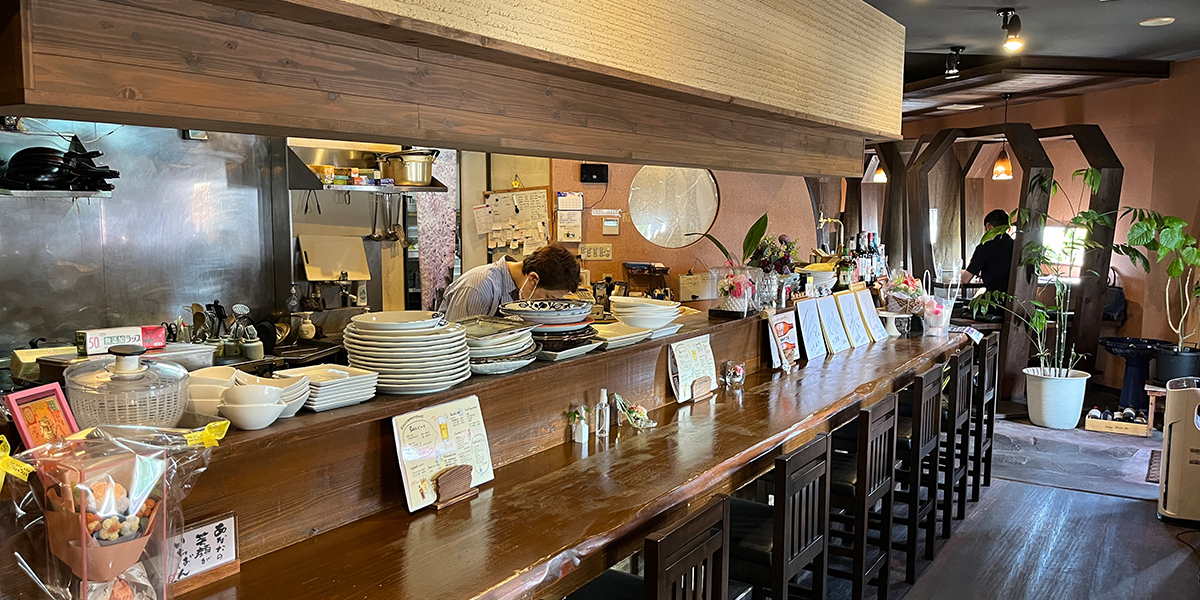 鳥栖市東町に佇む、旬の地元素材にこだわった飲食店。自家製のジャポネソース、鳥栖産のたまごを使った具沢山な茶碗蒸し等を求めて、常連客は何度も足を運ぶ。旬野菜を贅沢に使用した彩り豊かな料理は、見た目からも美味しく仕上げられており、食事を楽しんでもらいたい想いが伝わってくる。店内の雰囲気や接客に対する姿勢、お客様を喜ばせるための工夫が随所に見られる。
