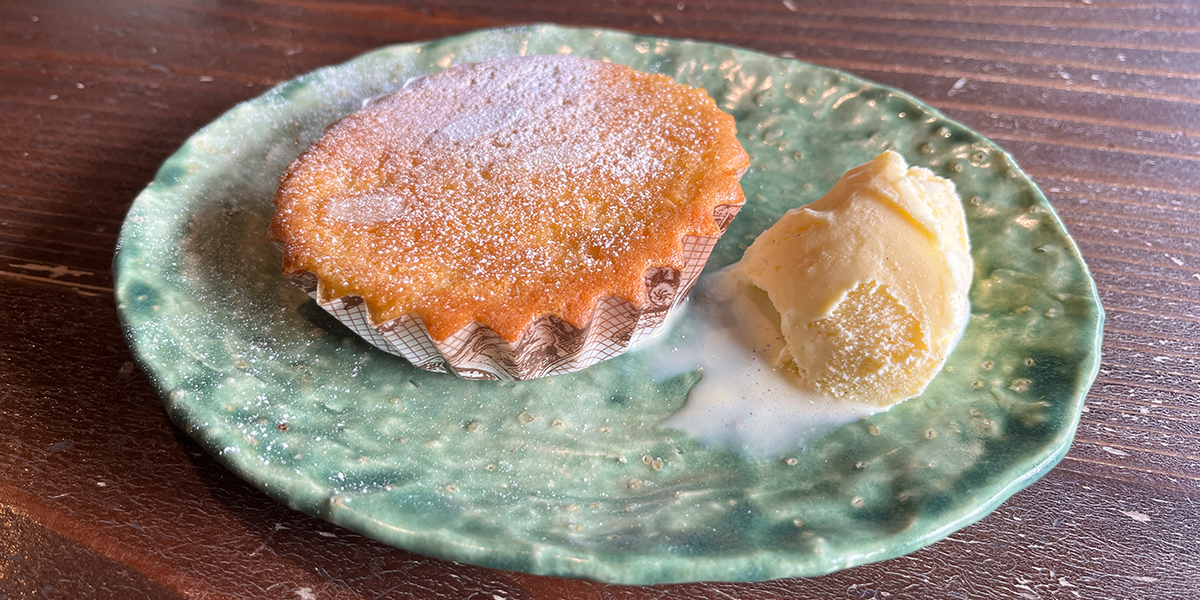 数年前から「春栄堂」で販売されていた「マドレーヌ」の提供が始まった。ほのかに温かい「マドレーヌ」と一緒に添えられた「アイス」との相性は抜群。ランチを注文された際には、是非とも注文いただきたい一品。